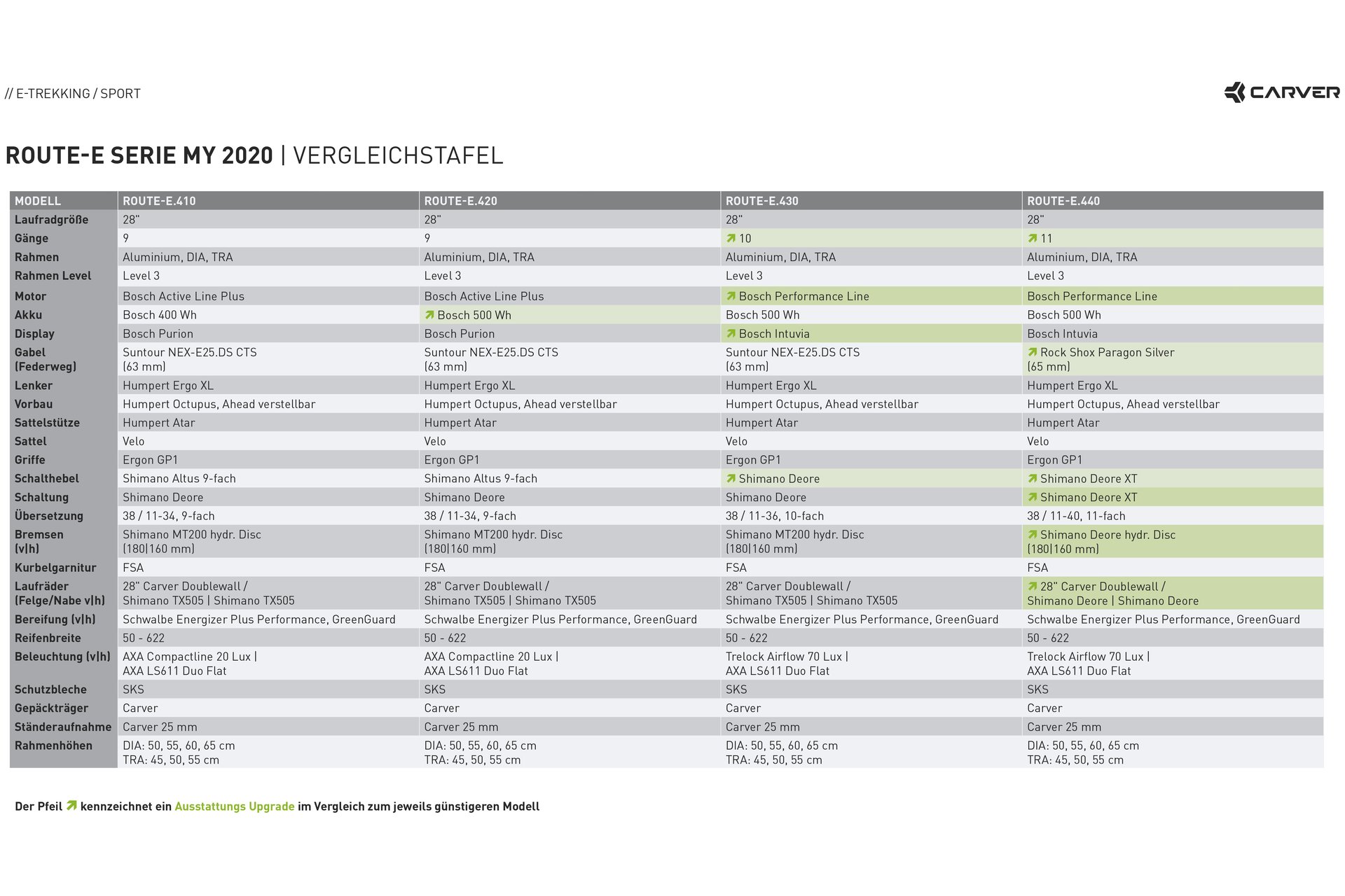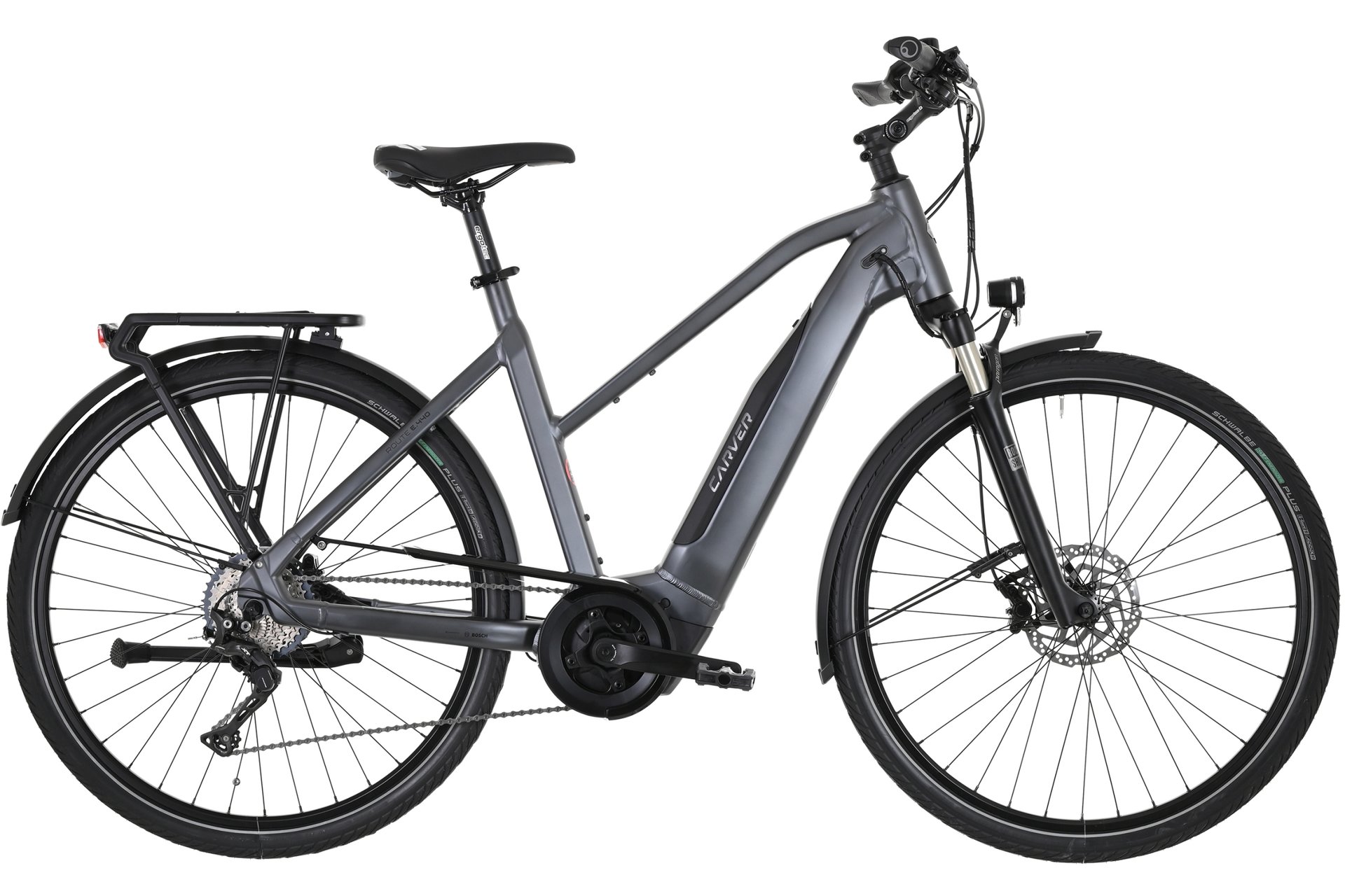 Carver Route E.440 Dafür sorgt der schöne Damen Sport Rahmen aus Aluminium und der sinnig platzierte 500 Wh Intube-Akku. Gemeinsam mit den 28″ Laufrädern geht es daher zügig voran.